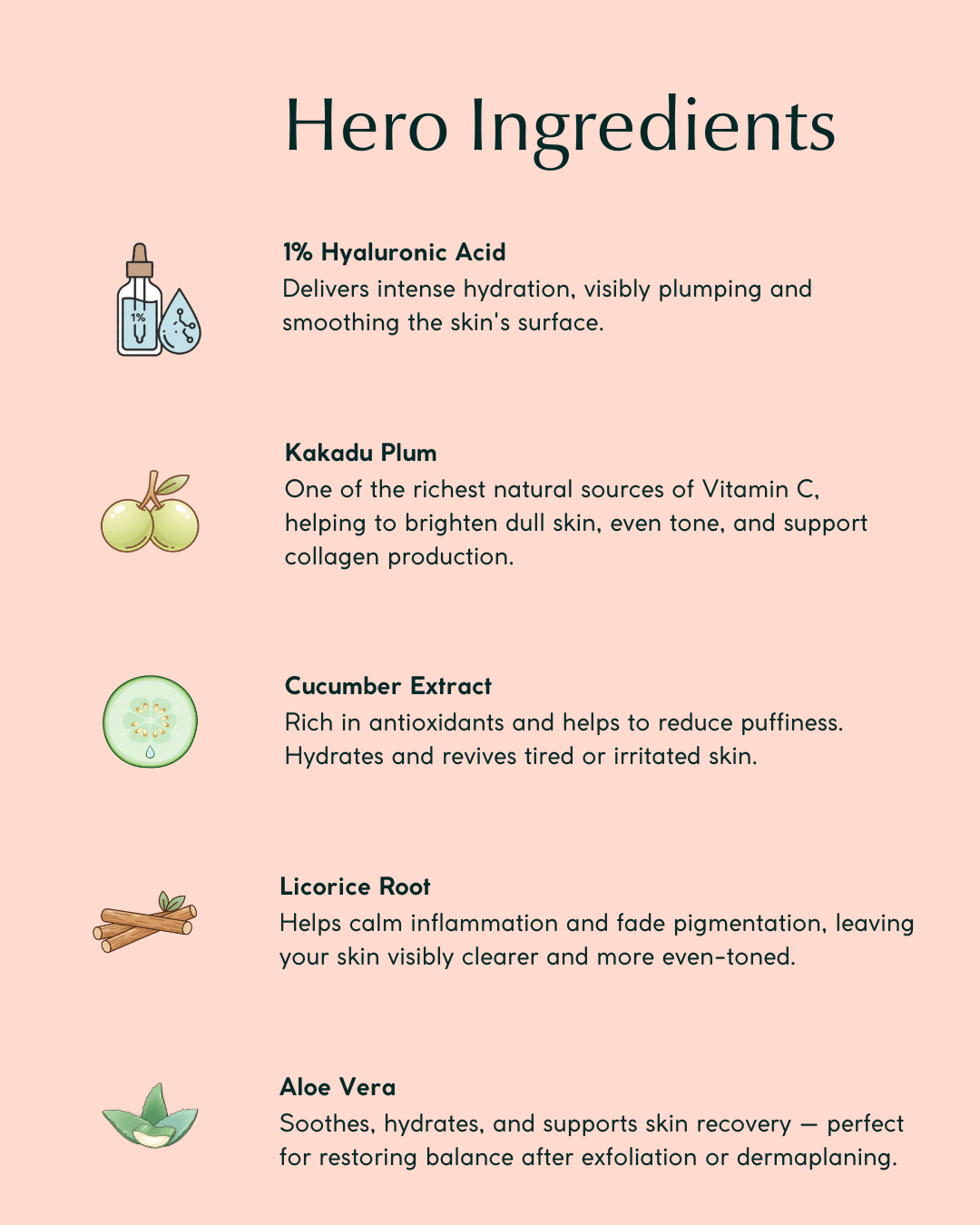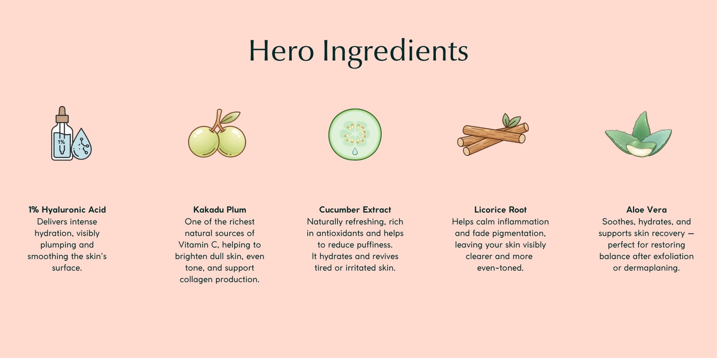 This formula combines 1% Hyaluronic Acid with Kakadu Plum (Vitamin C-rich), Witch Hazel, Aloe Vera, Cucumber Extract, Licorice Root, and Vitamin E. Together, these ingredients help to hydrate, soothe, brighten, and protect the skin from environmental stress, leaving it soft, radiant, and visibly healthy.