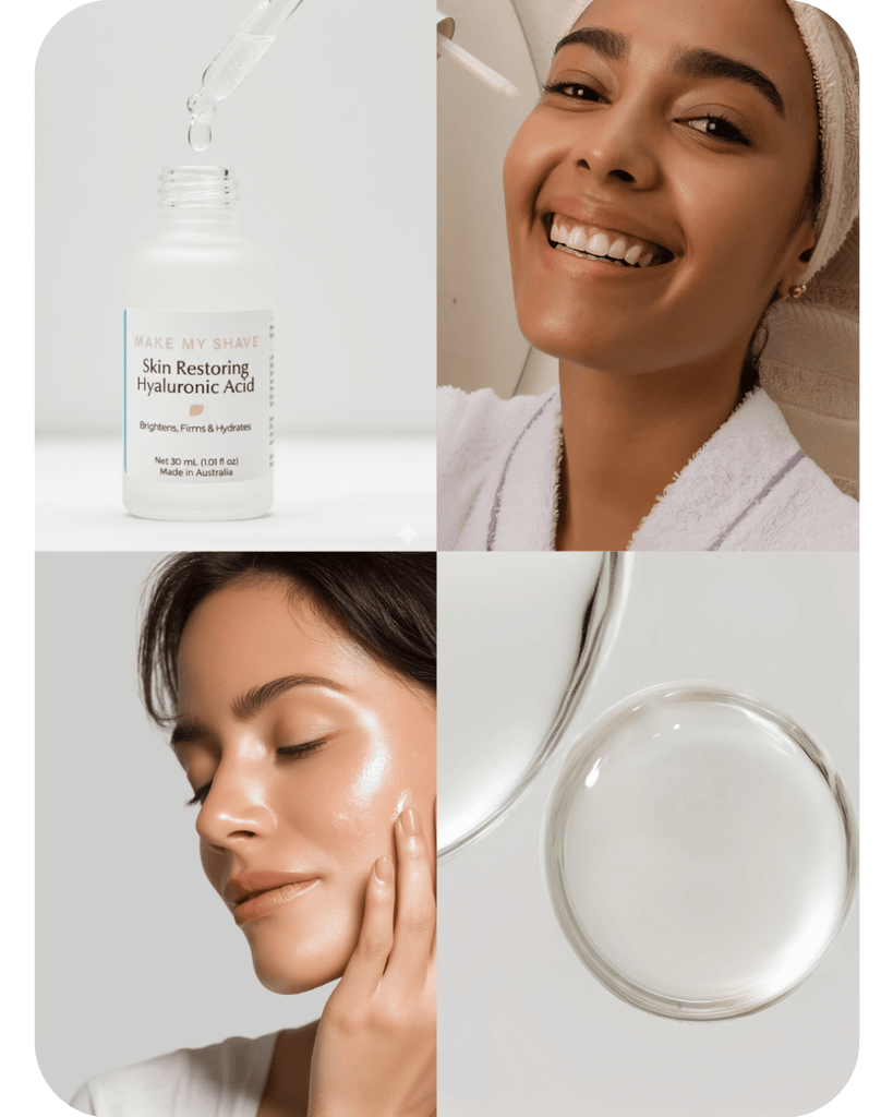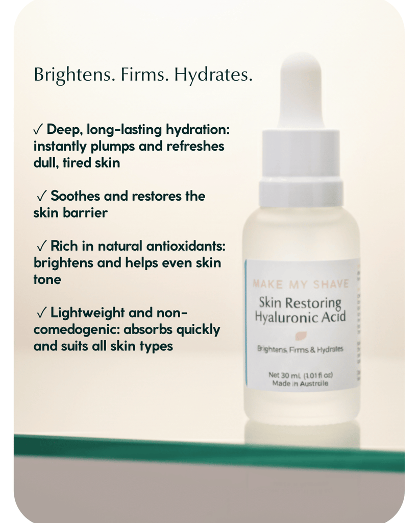 Hyaluronic Acid (HA) is a powerful humectant that helps your skin retain moisture. Our Skin Restoring Hyaluronic Acid Serum is formulated with 1% Hyaluronic Acid and a blend of soothing botanicals like Kakadu Plum, Witch Hazel, Aloe Vera, and Cucumber to deeply hydrate, calm, and restore the skin barrier. The result? Fresh, glowing, and balanced skin, morning and night.